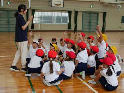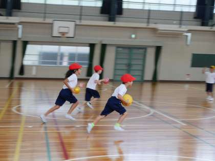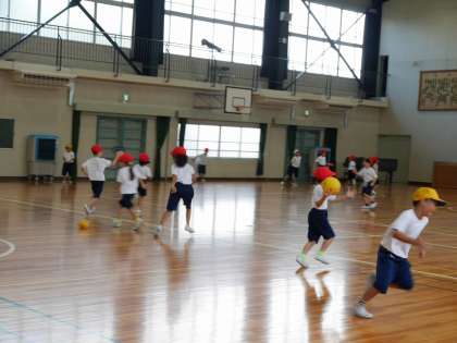 「ドッジおに」ボールを投げて当たったらおにになるおにごっこをしていました。