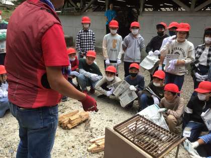 カレー作りが始まりました。かまど係でかまどの準備をしています。