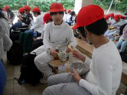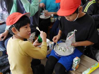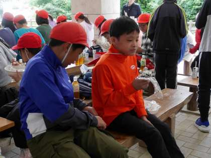 朝食はアルファ米のわかめご飯と野菜ジュースです。 防災食の体験も兼ねて。