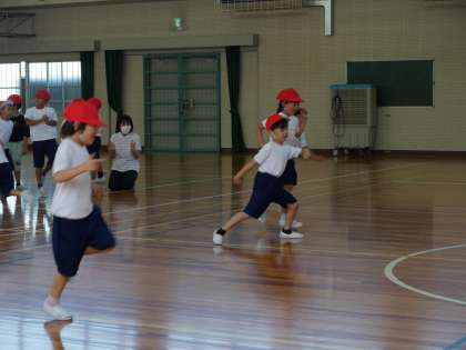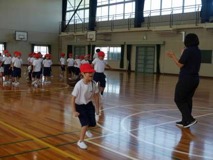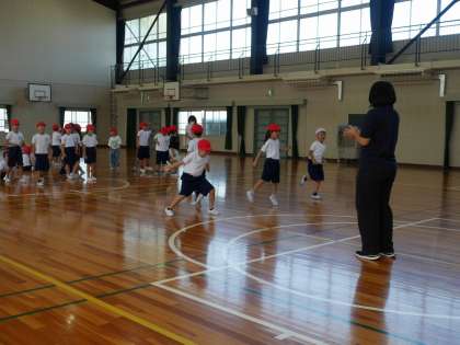 「けん・けん・ぱ」のリズムでステップを踏む運動をしました。