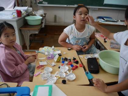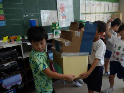 1年生にいろいろなゲームで遊んでもらうための、遊び道具を作っていました。