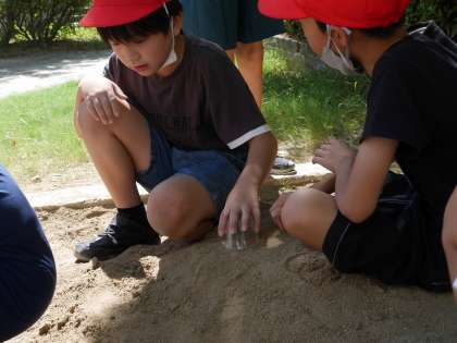 土の粒の大きさによる水のしみこみ方の違いについて考えました。
