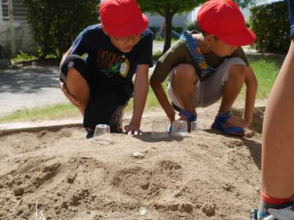 予想を立てた後、砂場でうつぶせにしたプラコップに水滴がつくかどうか観察しました。