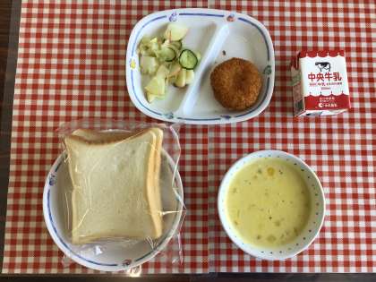 今日の給食は、『スライスパン、コーンクリームスープ、りんごサラダ、えびカツサンド、牛乳』です。
