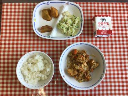 今日の給食は、『ごはん、ピリット厚揚げ、バンバンジー、大学いも、牛乳』です。
