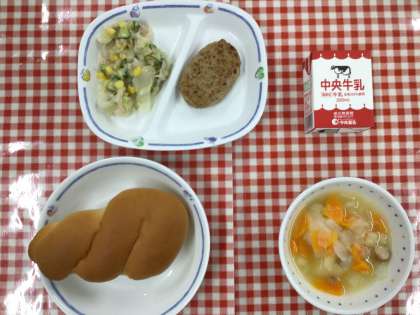 今日の給食は、『ツイストパン、ポトフ、ツナサラダ、ハンバーグ、牛乳』です。