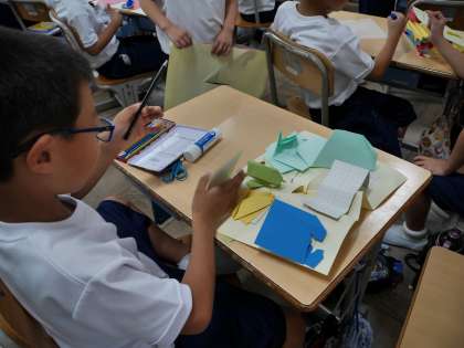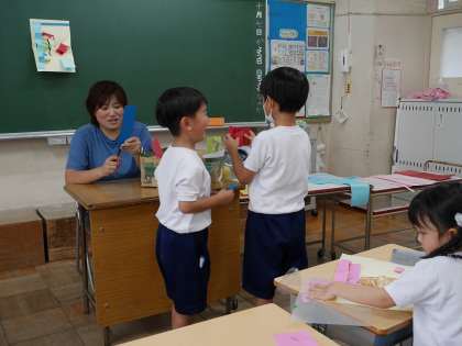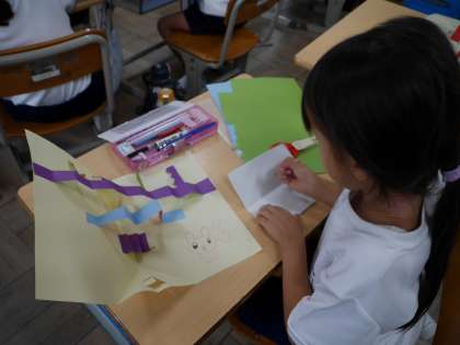 色画用紙を使って、おうちの方への飛び出す手紙を作っていました。