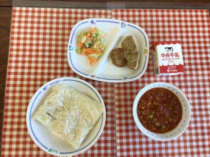 今日の給食は、『豊田めん、ミートソースかけ、コールスローサラダ、さかなナゲット、牛乳』です。