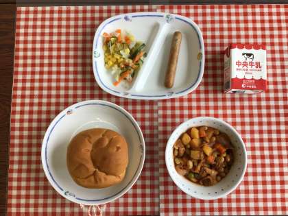 今日の給食は、『りんごパン、ポークビーンズ、フレンチサラダ、ウインナー、牛乳』です。