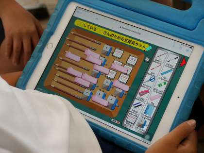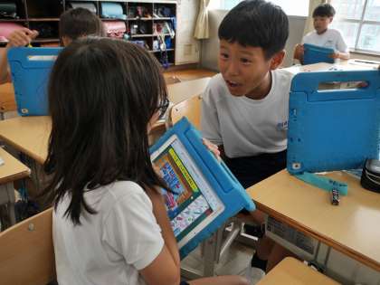 「Do you have a pen?」学習用タブレットを使って、自分が何を持っているか答えていました。