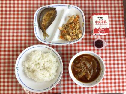 今日の給食は、『ごはん、とよたみそ汁、とよたチャンプルー、あゆの一夜干し揚げ、ブルーベリーゼリー、牛乳』です。