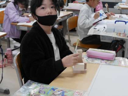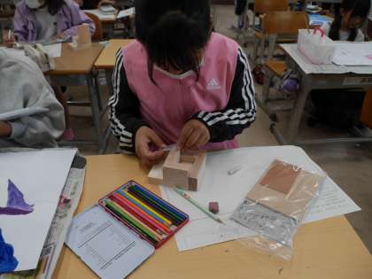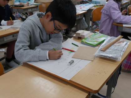 木材をくぎと金づちを使って組み立てる学習です。 今日は設計図を作っていました。