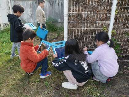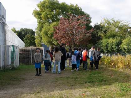 子どもたちが秋さがしに校庭に出てきました。