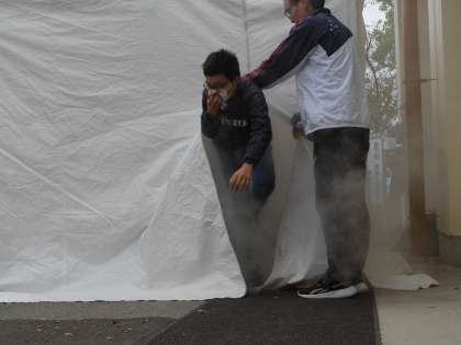 今回はバニラの香りの白い煙でしたが、実際には有毒な黒煙が充満して目も開けられない状態だということを、子どもたちには想像してほしいと思います。