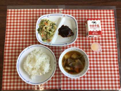今日の給食は、『ごはん、八杯汁、和風サラダ、さばのみそ煮、なしゼリー、牛乳』です。