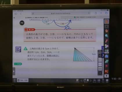 「三角形の底辺の長さを変えずに、高さだけ2倍、3倍としていったら面積はどうなるか」表を使ってその変化を確かめ、比例していることを学びました。