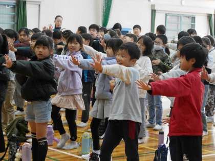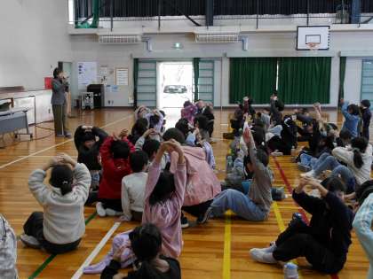 クイズを織り交ぜながら、「睡眠をとると、元気が出る、勉強の成果が出る、運動がよくできる」というお話を聞きました。