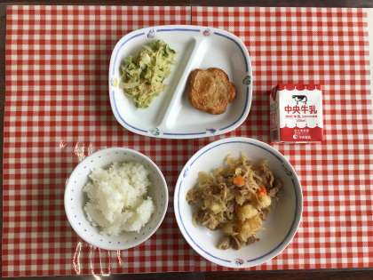 今日の給食は、『ごはん、肉じゃが、たくあんあえ、花形はんぺん、牛乳』です。