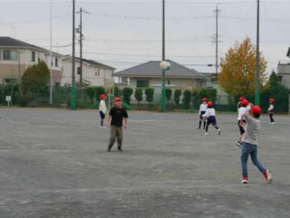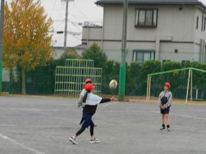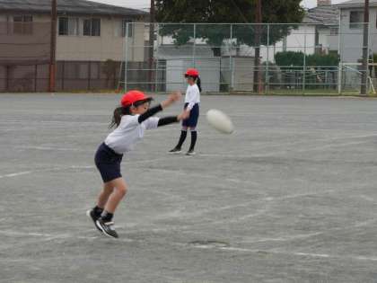 タグラグビーの学習です。 ウォーミングアップでラグビーボールでパス練習をしていました。