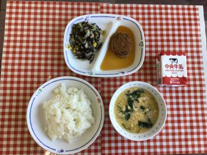 今日の給食は、『ごはん、かきたま汁、ひじきサラダ、ハンバーグのおろしソースかけ、牛乳』です。