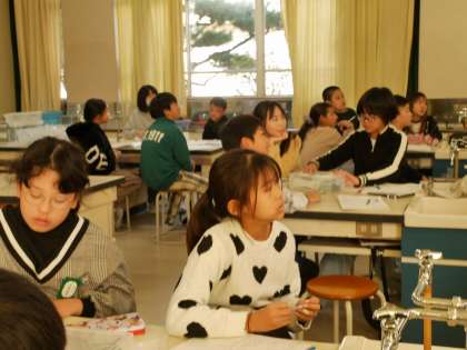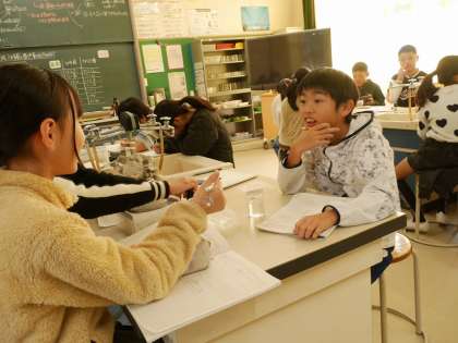 「水に食塩を溶かしたとき、溶かす前と後では水の重さはどうなる?」実験結果を報告し、そこからわかることを考えていました。