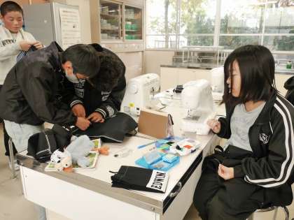 エコバッグにボタンをつける学習です。 四つ穴のボタンをしっかりバッグに留めます。