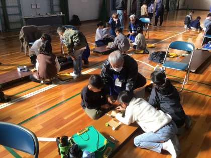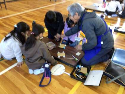ものづくりサポーターの方々と一緒に、風の力で動く車を作りました。最初に車体を作りました。
