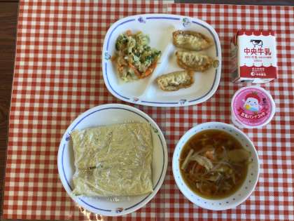 今日の給食は、『中華めん、しょうゆラーメン、チンゲンサイのあえもの、揚げぎょうざ、豆乳パンナコッタ、牛乳』です。