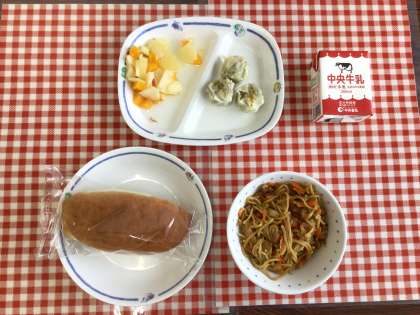 今日の給食は、『米粉パン、焼きそば、りんごポンチ、野菜入りしゅうまい、牛乳』です。