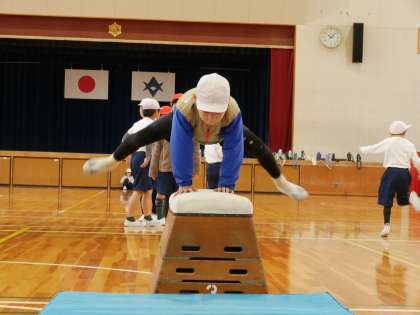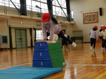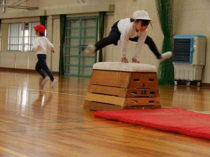 まず、腕でとび箱を押す感覚を確認した後で、実際に跳んでいました。
