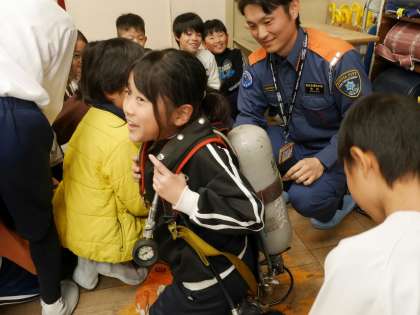 消防署の役割や防火についての講義の後、実際に消防士さんが使う道具に触れてその重さや機能・役割について学びました。