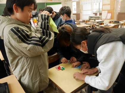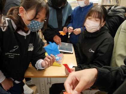教室に入ったらみんな集まっておりがみを折っていました。