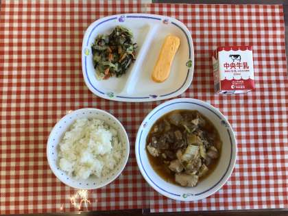 今日の給食は、『ごはん、すき焼き風煮、海藻サラダ、厚焼き卵、牛乳』です。