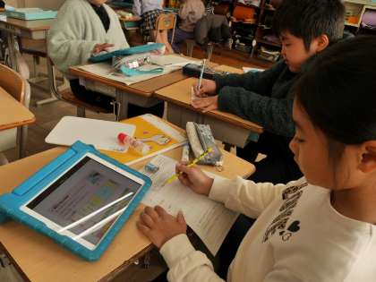 火曜日の防火教室の学習内容を踏まえて、消防署の役割について副読本(デジタル教科書)を使ってまとめていました。