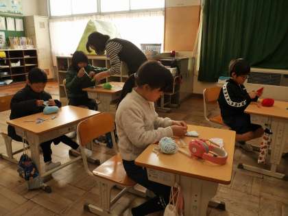 3組ではクリスマスツリーに飾るミニツリーのオーナメントを毛糸を使って作っていました。