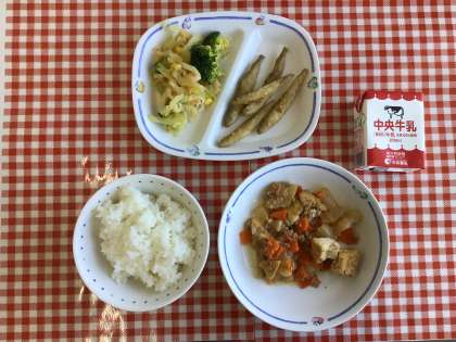 今日の給食は、『ごはん、だいこんのそぼろ煮、れんこんとブロッコリーのサラダ、わかさぎのから揚げ、牛乳』です。