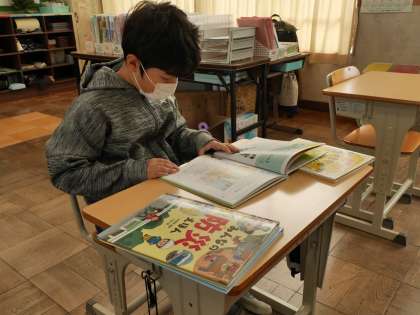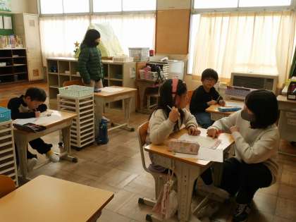 1、2組は交流学級の授業に行っている友達が多く、先生とマンツーマンで学習していました。