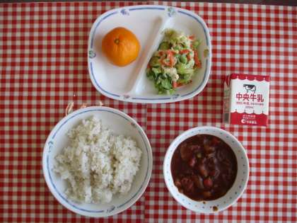 今日の給食は、『麦ごはん、ハヤシライス、チキンサラダ、みかん、牛乳』です。