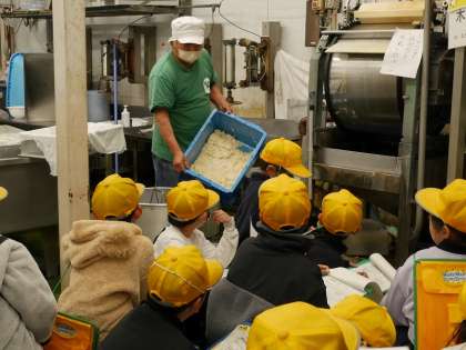 3年総合(校外学習) 公開日 2025/12/03 更新日 2025/12/03 各学年から 大豆の学習の一環で近くの豆腐店を訪問し、豆腐のつくり方の学習をしました。 お店の方のたくさん質問をして、豆腐について知識を深めました。 3年