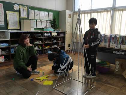 2組では新聞紙でクリスマスツリーを作っていました。