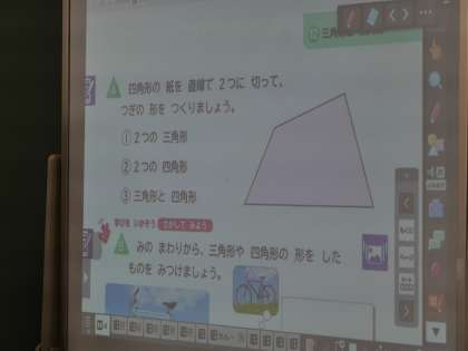 2年算数 公開日 2025/12/10 更新日 2025/12/10 各学年から 「三角形と四角形」 四角形を二つに切って二つの三角形や二つの四角形、三角形と四角形などを作ります。 ああでもない、こうでもないと子どもたちは知恵をしぼっていました。 2年