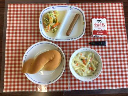 今日の給食は、『ツイストパン、マカロニのクリーム煮、サワーキャベツ、ウインナー、コーヒー牛乳の素、牛乳』です。