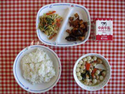 今日の給食は、『ごはん、ふだま汁、おかかあえ、レバーとさつまいもの甘辛煮、牛乳』です。