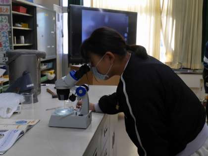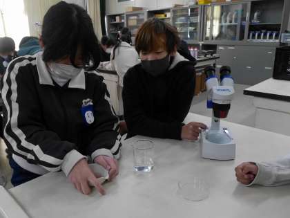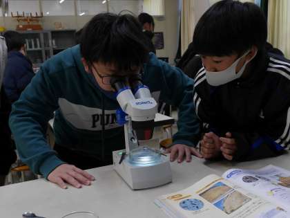 火山灰の粒子を顕微鏡で観察する学習です。 鹿沼土の粒を水で溶いて顕微鏡で観察していました。