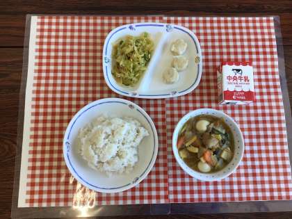 今日の給食は、『麦ごはん、中華飯、華風あえ、えびしゅうまい、牛乳』です。