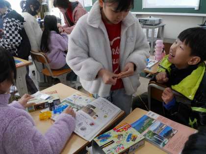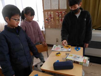 豆電球の回路のエナメル線を何人分もつなげて長くしても電気がつくかどうかを試していました。