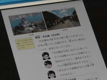 国宝・犬山城はなぜ今日まで当時の姿で守られてきたのかをデジタル教科書の資料を使って学んでいました。