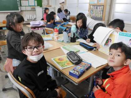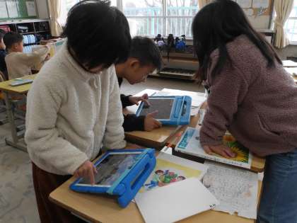 町探検で見つけたことを生活・総合発表会で発表するために、グループで準備をしていました。