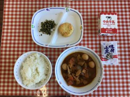 今日の給食は、『ごはん、根菜のみそ煮、七草ごはんの具、豆腐しんじょ、乾燥小魚、牛乳』です。