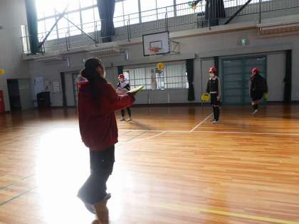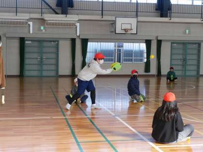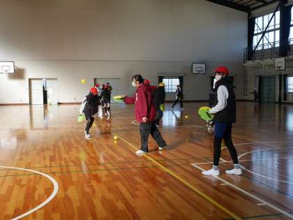 手に装着するラケットでスポンジボールを打ちます。